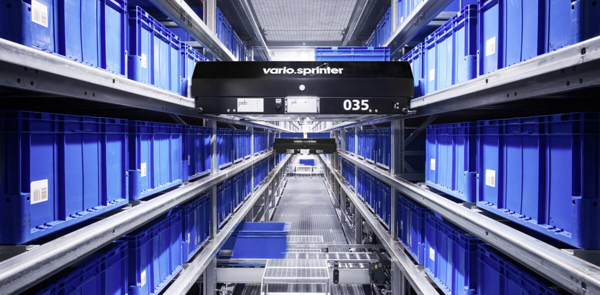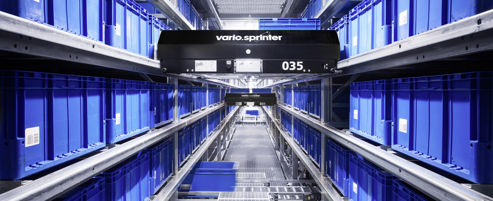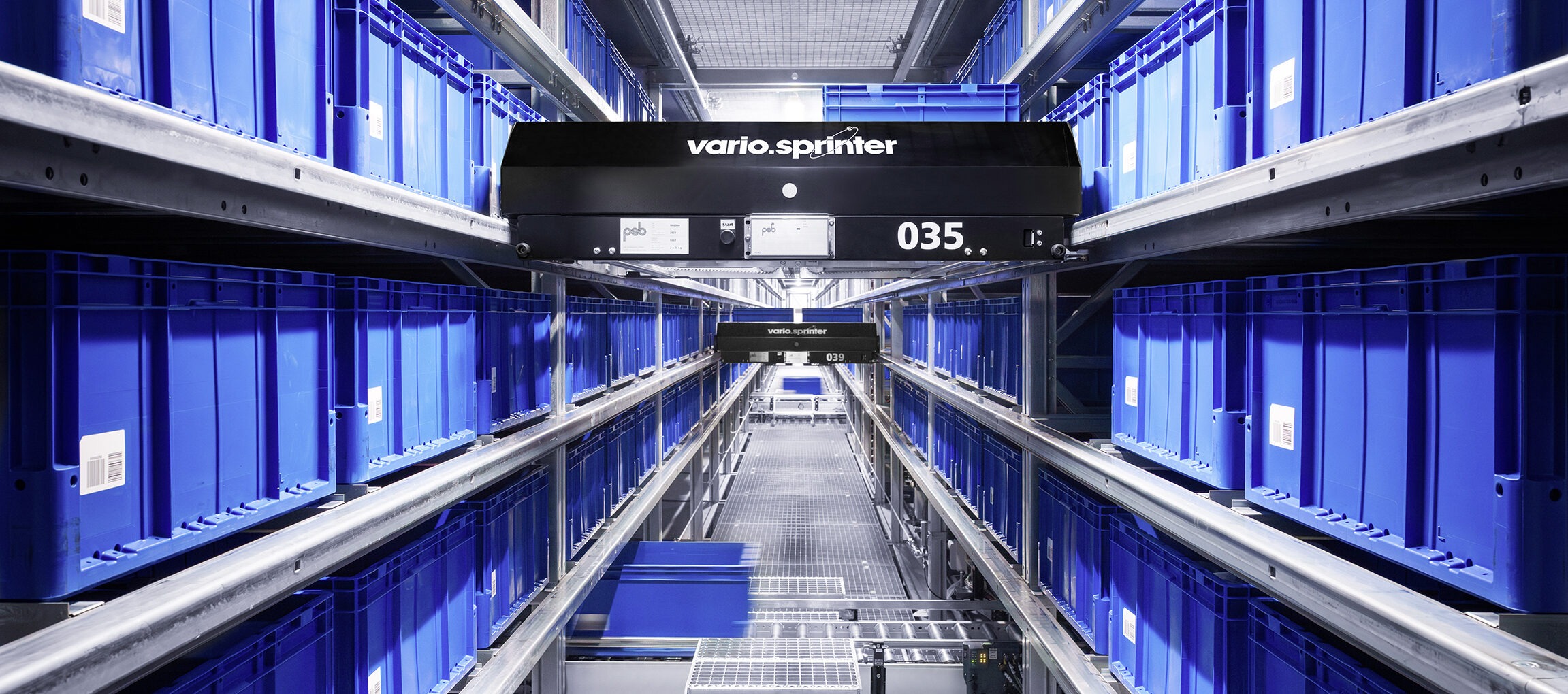 psb a installé pour Bergzeit un magasin à navettes à sept allées avec plus de 55.000 emplacements de bacs sur 27 niveaux. Les élévateurs pour les 56 navettes ainsi que les élévateurs à bacs intégrés dans le magasin disposent chacun de deux préhenseurs, ce qui permet au système de mettre à disposition 2 400 bacs par heure aux postes de préparation de commandes. Une autre série d’élévateurs internes est déjà prévue et peut être facilement ajoutée à tout moment afin d’augmenter encore la performance du stockage.